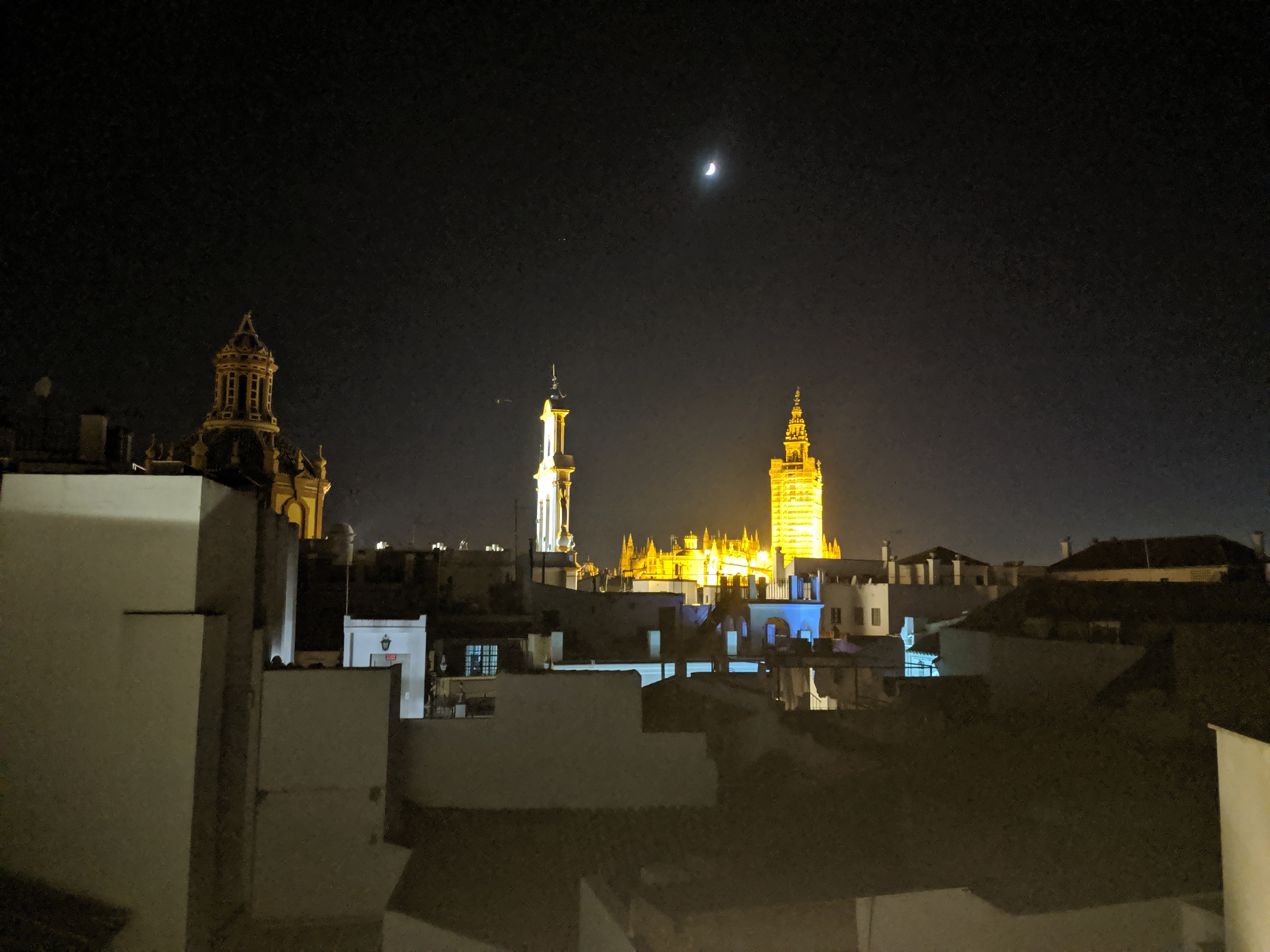 After seeing the cathedral and the maze of alleys and going to see a little bit of flamenco dancing, we returned to our hotel tired and it seemed like that was going to be the end of our night. But Andrea suggested that we go to the rooftop lounge and maybe get a quick drink for ourselves and a little snack for the boys. From up there we could see parts of the city lit up. I think when I think of Seville for the rest of my life I will always think of that image of the cathedral, lit up like a beacon not more than a few blocks from our hotel. I enjoyed my gin and tonic, the first I’ve had since I was 21 and I was a little concerned the next morning I’ve got a headache but nonetheless I enjoyed it. The heat of the day had dissipated and there was just a cool air that surrounded us. The bartender had a gentle smile and he seemed so happy to be there with us, which seemed odd to me. I think that’s just more of what Spain is about…the people. There are the cathedrals, bull rings, beautiful landscapes, enormous castles, prehistoric caves and everything else that Spain has to offer, yet it is the people that I will always remember.