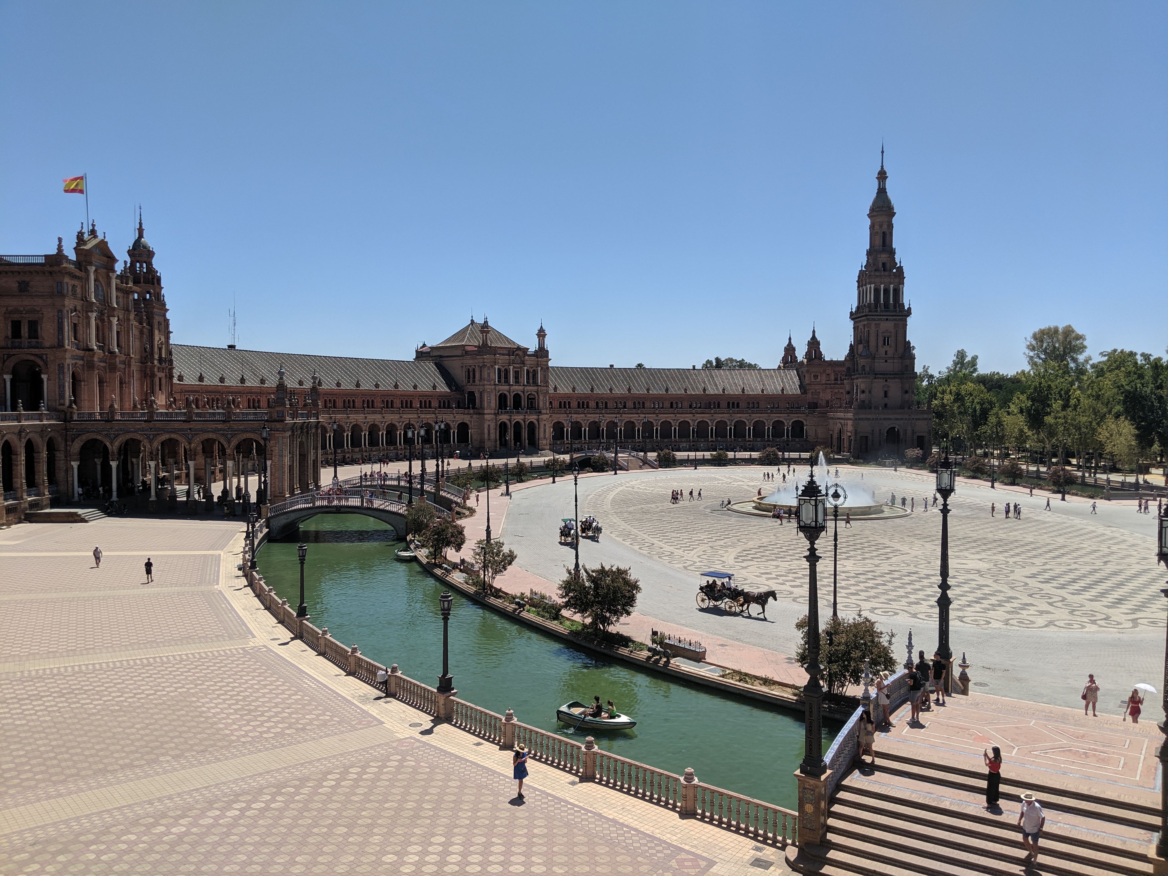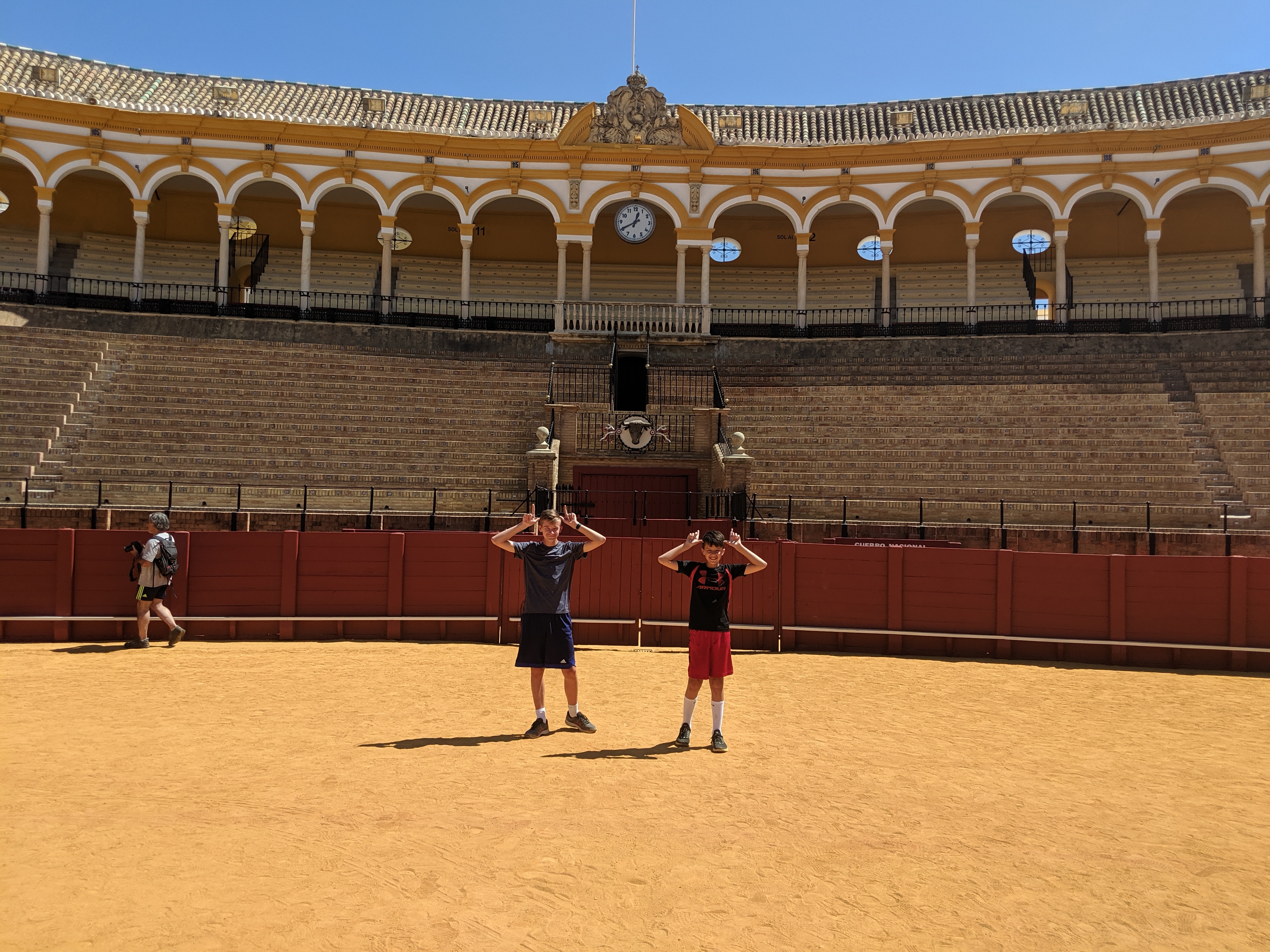 Exploring parts of Seville was done at a fast pace as we raced from one place to another. We were in the city for barely 24 hours and there was so much to see. We raced over to the river to look at an old Moorish tower and the modern bridges built across it. We then ventured to the park and saw Plaza de Espana, one of the most amazing buildings that I had ever seen in my 46 years of life. It is a building so strange and beautiful, it was used as a Naboo building in a deleted scene from the Star Wars prequels. I’ve never seen a building like this that shaped in this grand curve with towers at either end. Blue and white tile decorated it with yellow streaks, highlighting the might of Spain during it’s years of exploration and conquest. The boys soaked up the deep history of the building.